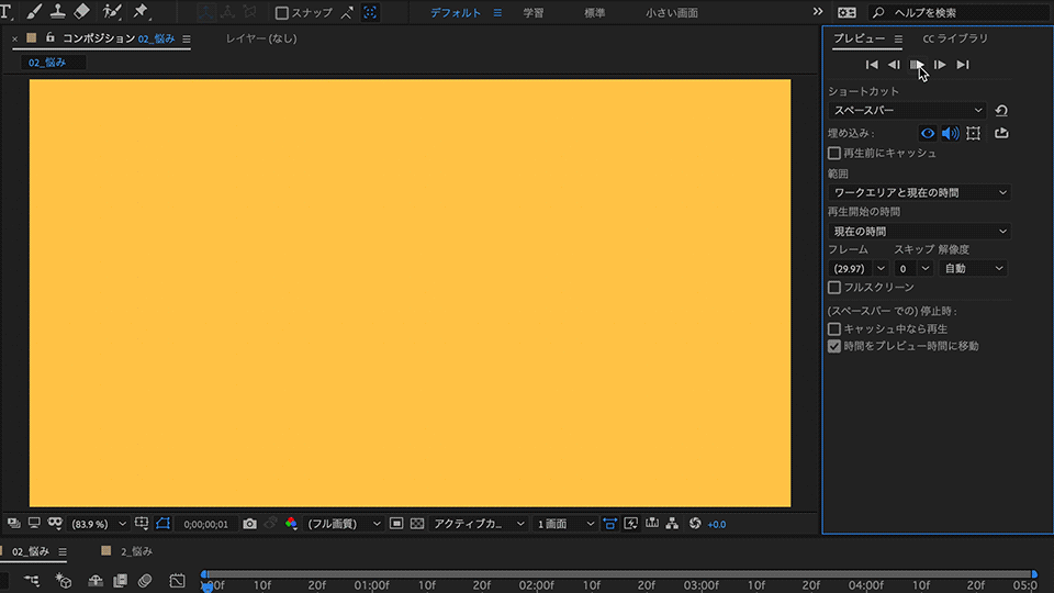 5. 「コンポジション設定」ウィンドウに戻ったら「OK」をクリックします。After Effectsの作業画面が表示されます。