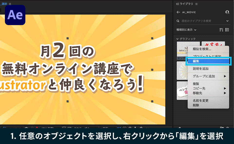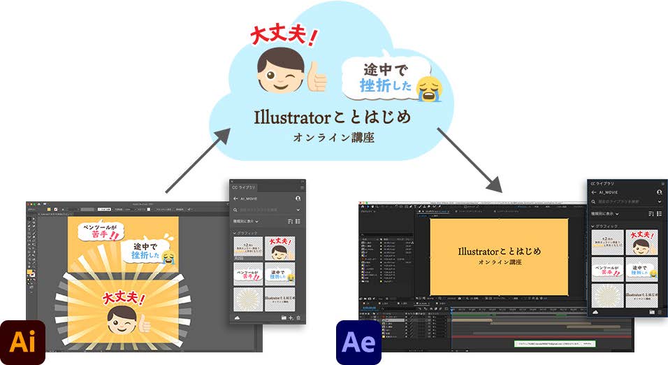 Illustratorで作成した素材をAfter Effectsに読み込む方法として、今回はCreative Cloudライブラリを使った素材の共有方法をご紹介します。