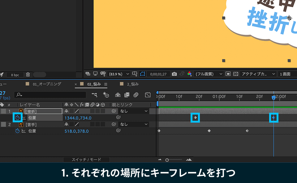 16. 「挫折」にも「苦手」と同じ不透明度を設定するため、タイムライン上の2つのキーフレームを選択して「cmd(ctrl)+C」でコピーします。
