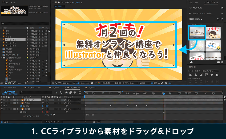 1. CCライブラリパネルからコンポジションパネルに「エンディング」をドラッグ&ドロップし、整列パネルで画面中央に配置します。