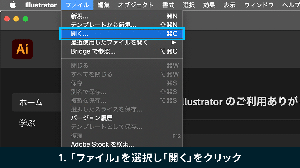 まず初めに、素材となるIllustratorのデータを確認します。Illustratorを起動し、「ファイル」→「開く」からサンプルファイル「material.ai」を選択して、「開く」をクリックします。