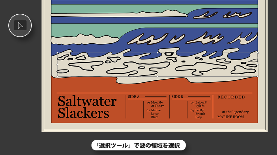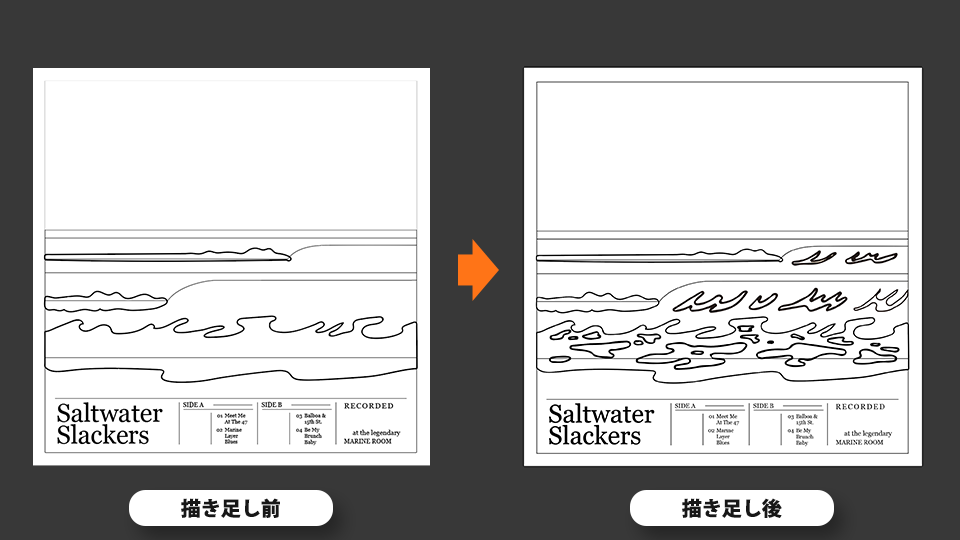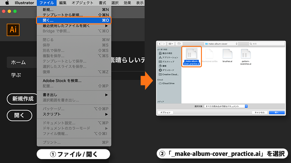 新規ドキュメントから鉛筆ツールでスケッチを行うか、「ファイル」-「開く」から練習用サンプルファイル「_make-album-cover_practice.ai」を選択して開きます。