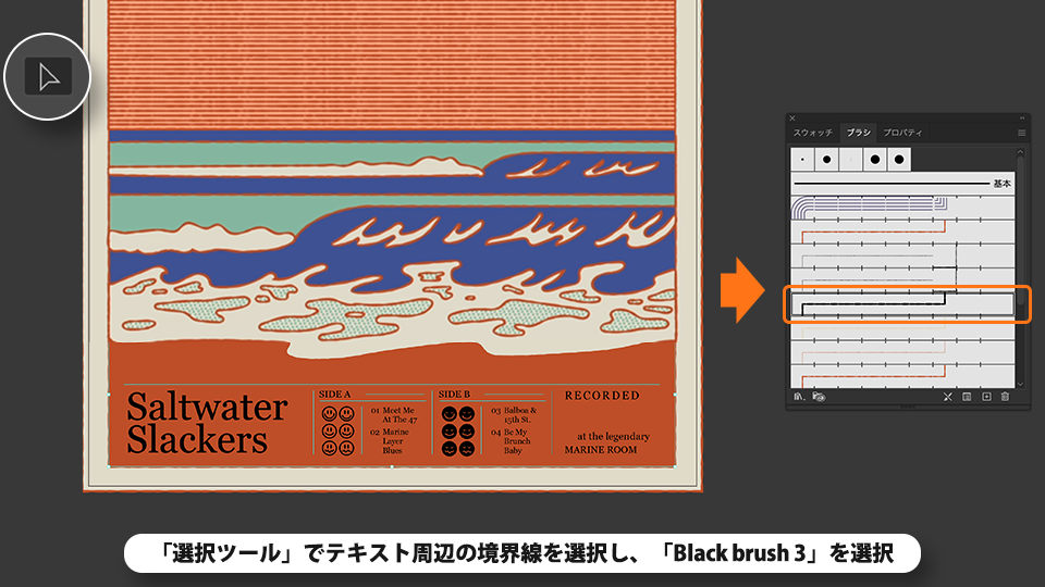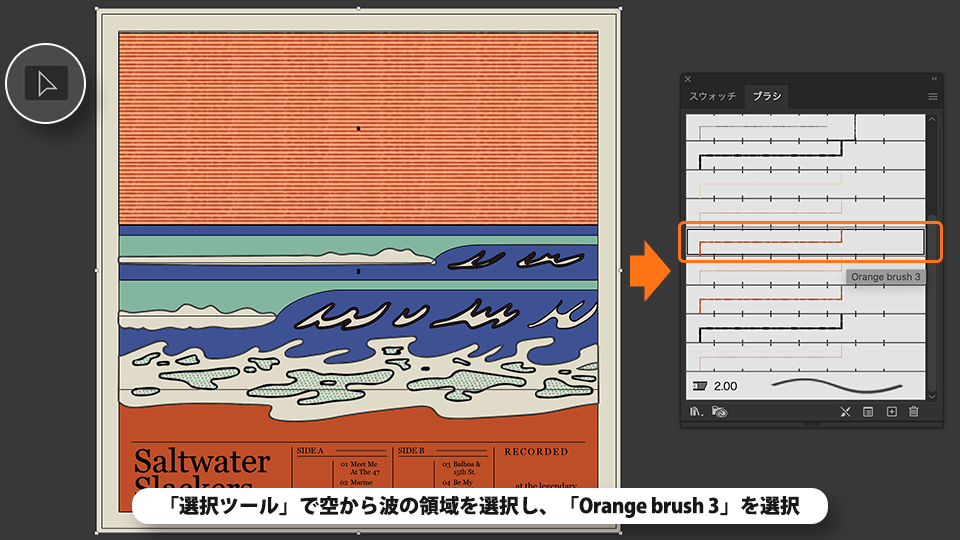 「選択ツール」でアートワーク内のそれぞれの領域を選択し、ブラシライブラリの「Orange brush 3」を選択して、ブラシを適用していきます。
