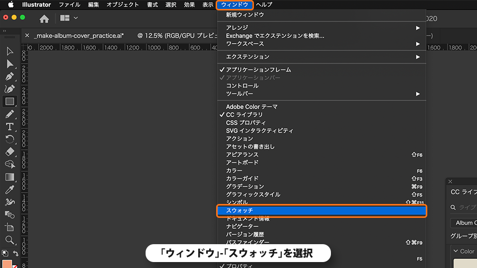 新規ドキュメントから作成を始めている場合は、スウォッチを読み込みます。