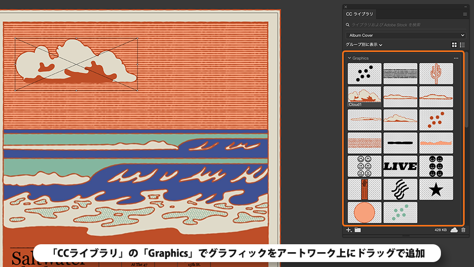 「CCライブラリ」の「Graphics」から雲、太陽、顔のアイコン、テキストのグラフィックをアートワーク上にドラッグで追加します。