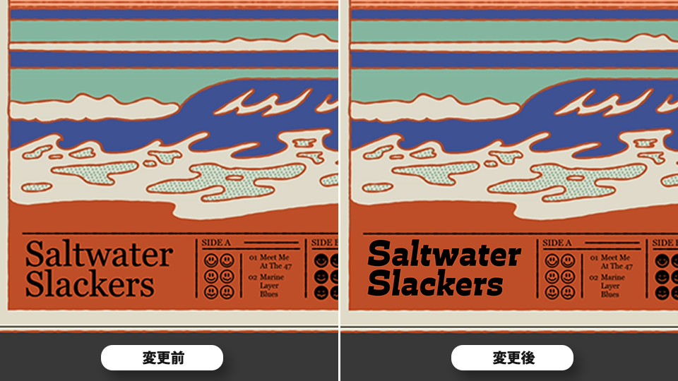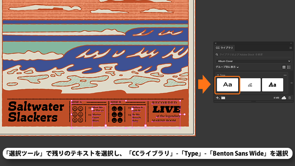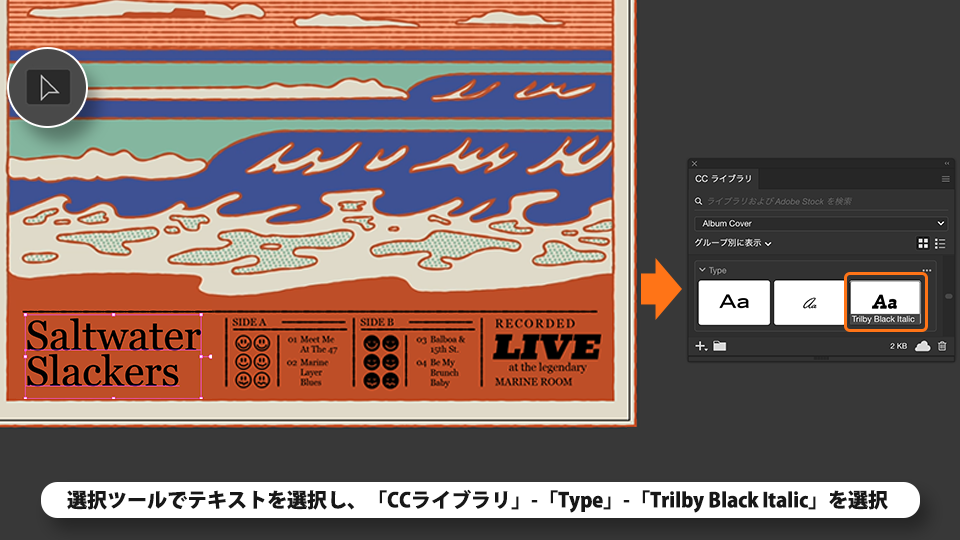 選択ツールで「Saltwater Slackers」のテキストを選択し、「CCライブラリ」の「Type」から「Trilby Black Italic」を選択します。