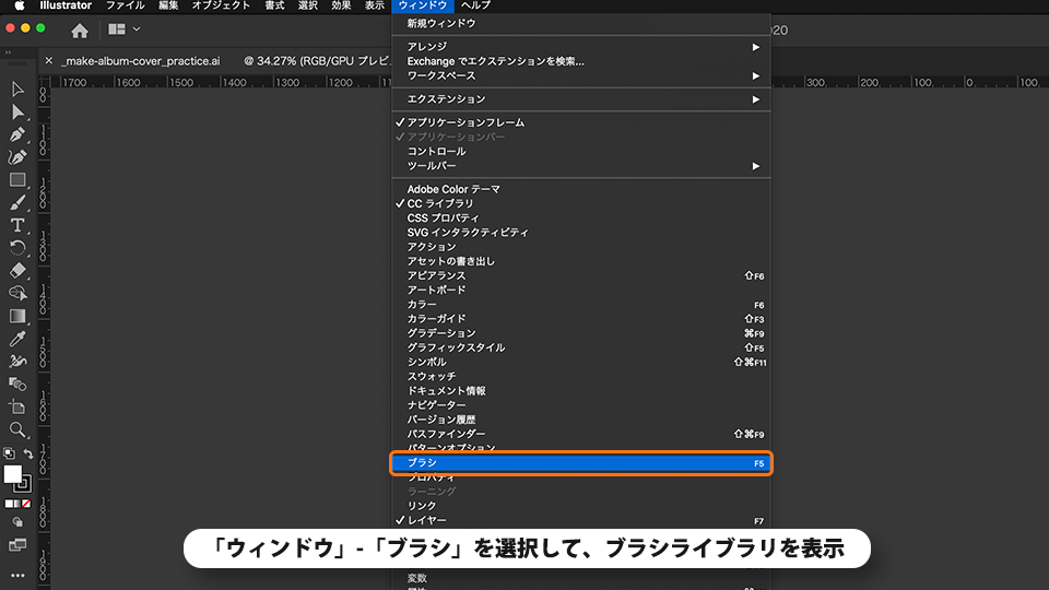 「ウィンドウ」-「ブラシ」を選択して、ブラシライブラリを表示します。