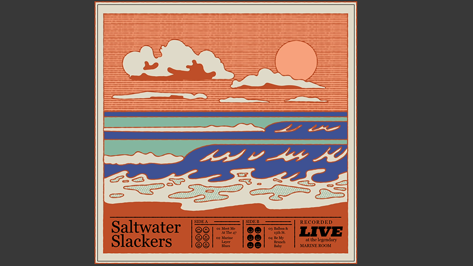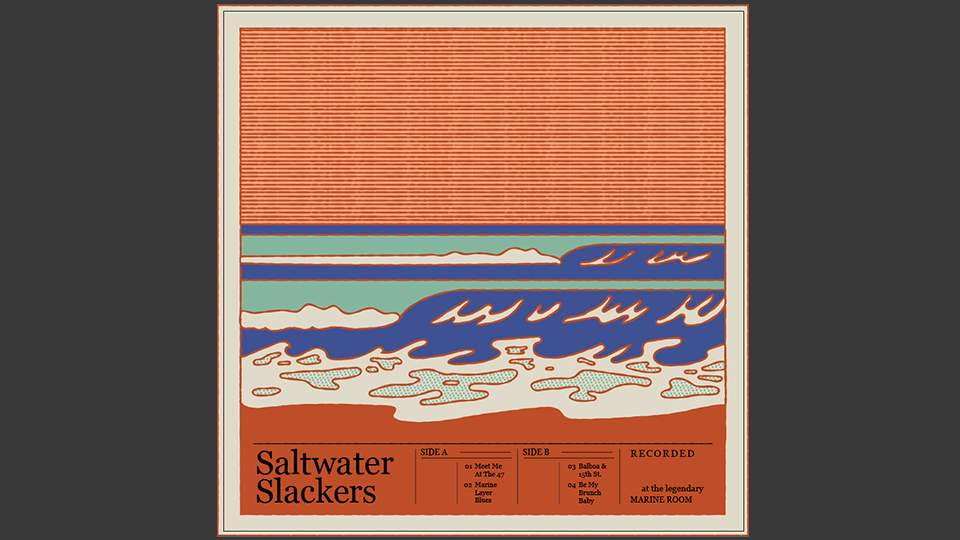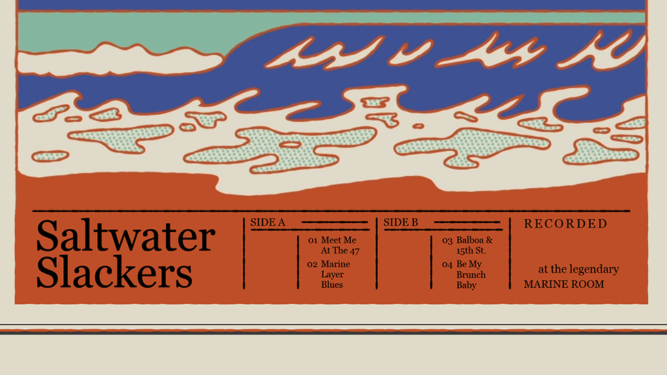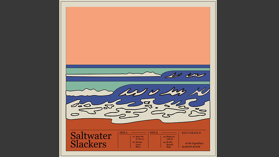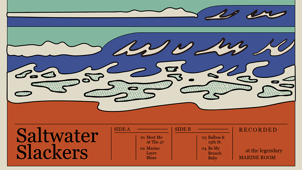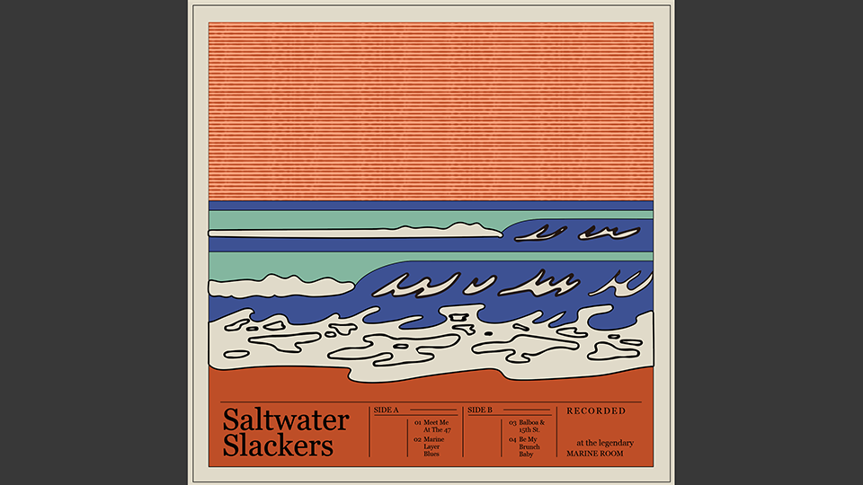 黒い線で空と波のデザインとテキストのアートワークが開きました。