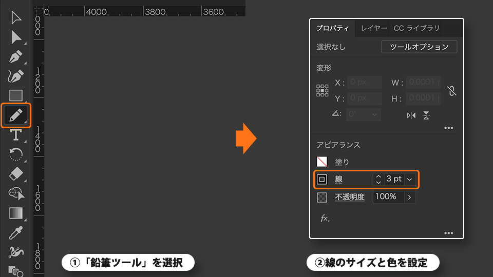 Creative Cloud Library、ブラシ、スウォッチ、鉛筆ツール、長方形ツール