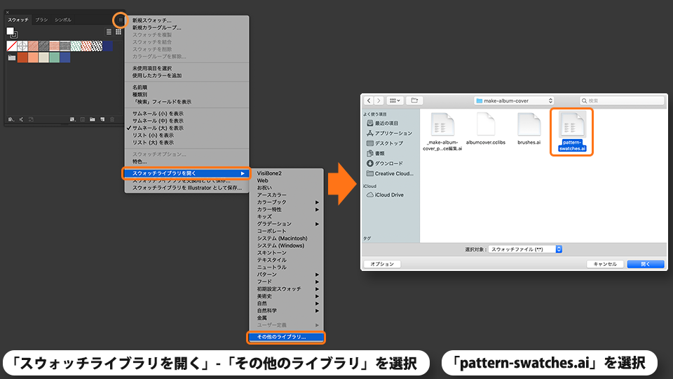 「スウォッチライブラリメニュー」-「その他のライブラリ」を選択し、スウォッチパネルから「New Pattern 2」を選択します。ダウンロードしたフォルダから「pattern-swatches.ai」を選択して「開く」をクリックします。