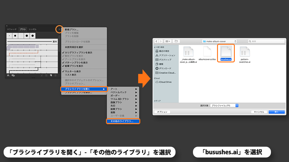 「ブラシライブラリメニュー」-「その他のライブラリ」を選択し、ダウンロードしたフォルダから「busushes.ai」を選択して「開く」をクリックします。