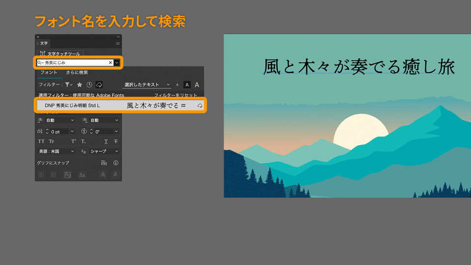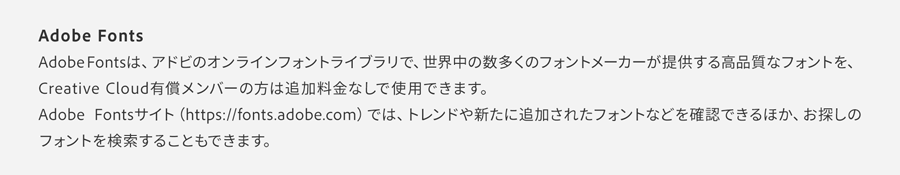 文字パネルの「さらに検索」タブをクリックすると、Adobe Fontsのフォントリストが表示されます。