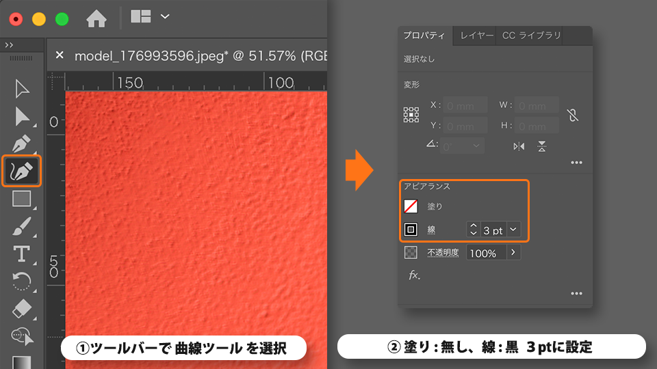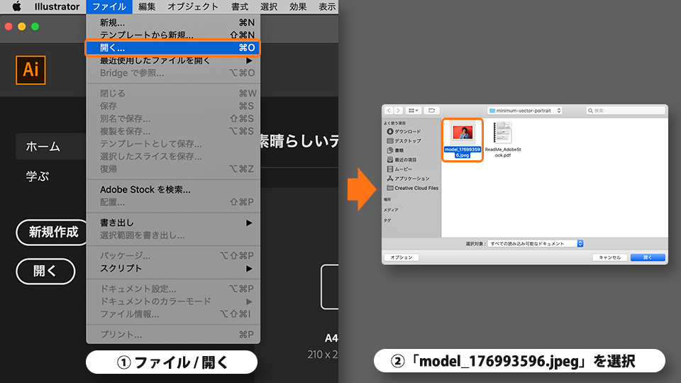 Illustratorを起動し、「ファイル」-「開く」から練習用サンプルファイル「model_176993596.jpeg」を選択して開きます。