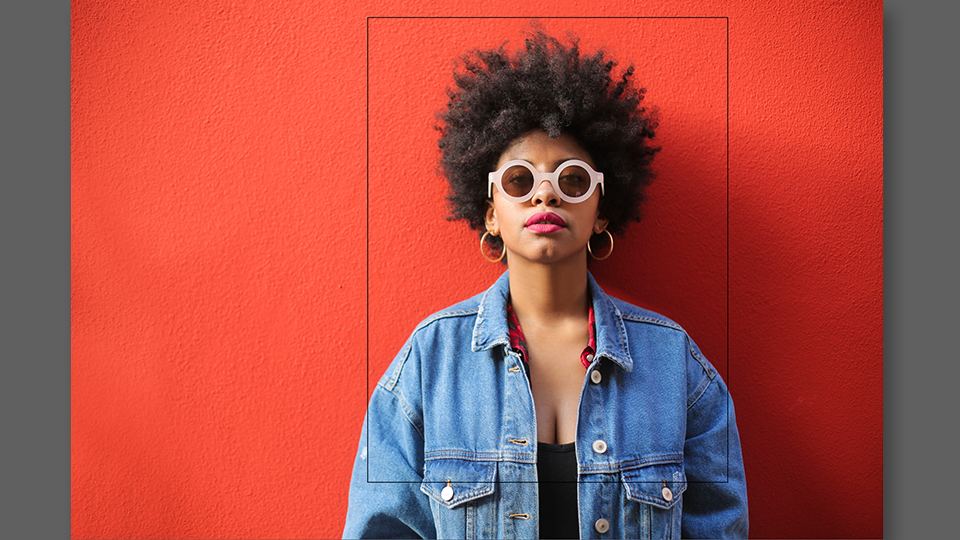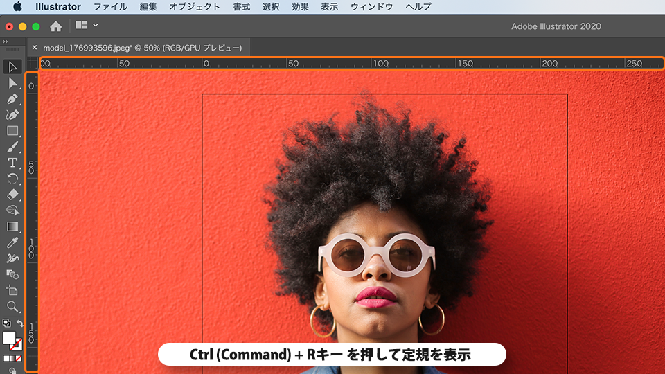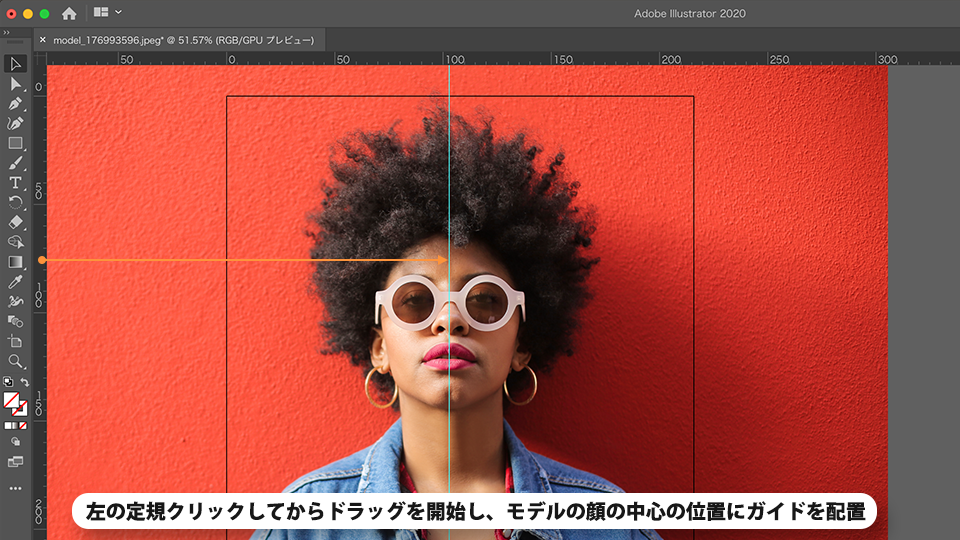 定規を表示後、モデルの顔の中心にガイドを配置します。