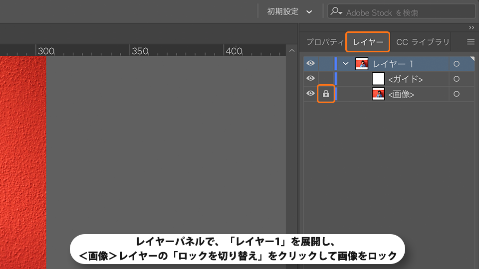 レイヤーパネルで、「レイヤー1」を展開し、<画像>レイヤーの「ロックを切り替え」をクリックして画像をロックします。