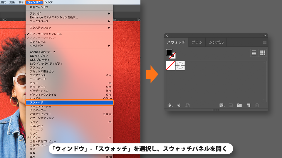 「ウィンドウ」-「スウォッチ」と選択して、スウォッチパネルを開きます。
