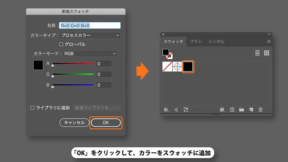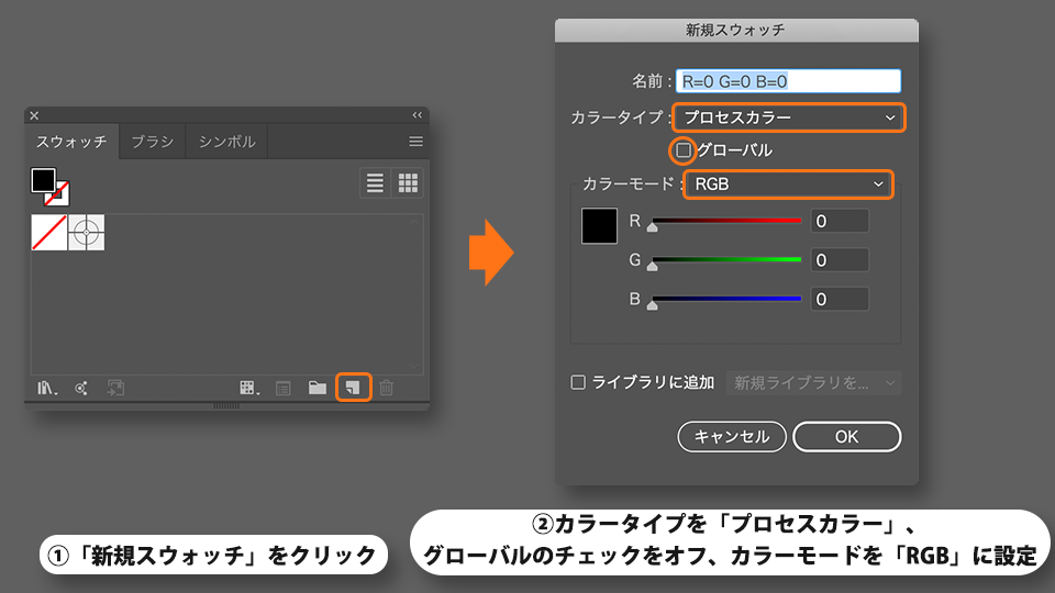 パネル下部の「新規スウォッチ」をクリックし、「新規スウォッチ」ダイアログボックスを開き、カラータイプを「プロセスカラー」に、 グローバルのチェックをオフ、 カラーモードを「RGB」に設定します。
