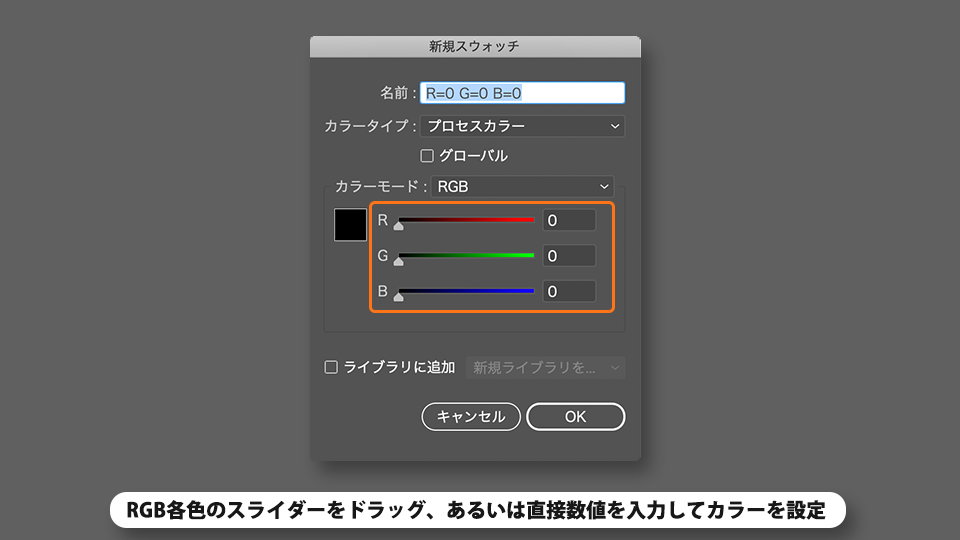 RGB各色のスライダーをドラッグ、あるいは直接数値を入力してカラーを設定します。ここでは、”R:0 G:0 B:0”を設定し、黒のカラーを作成します。