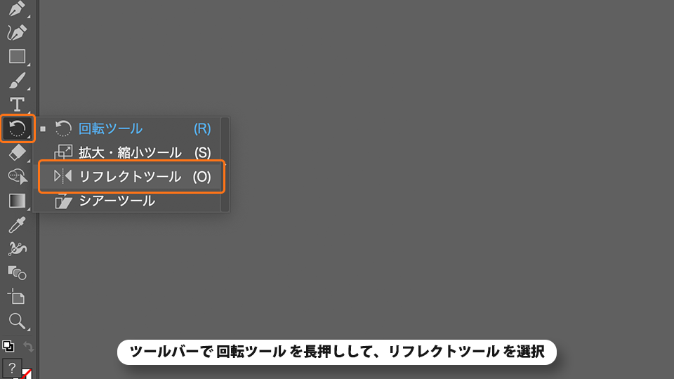 ツールバーで、「回転ツール」を長押しして、フライアウトメニューから「リフレクトツール」を選択します。