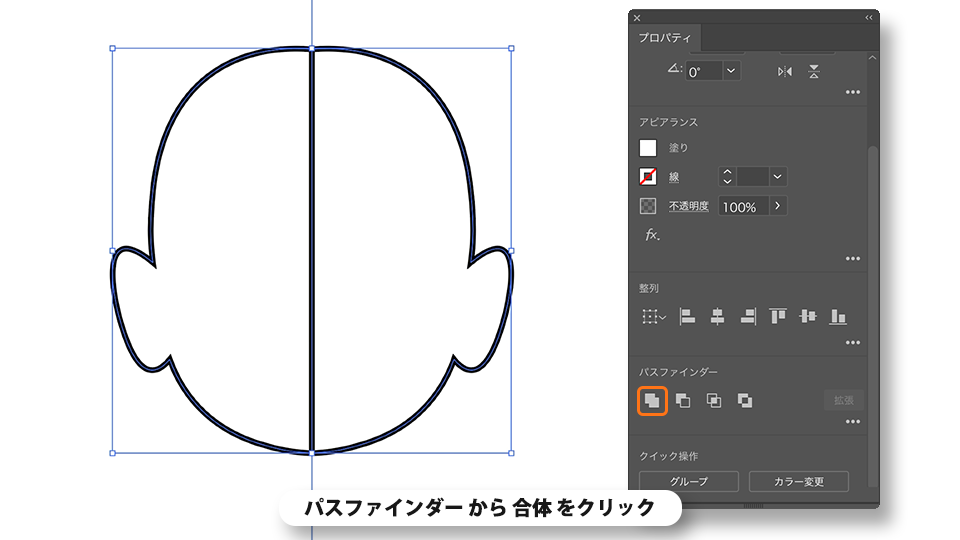 プロパティパネルを開き、「パスファインダー」セクションで、「合体」をクリックします。