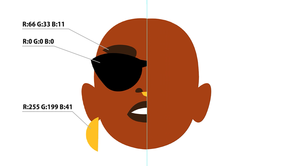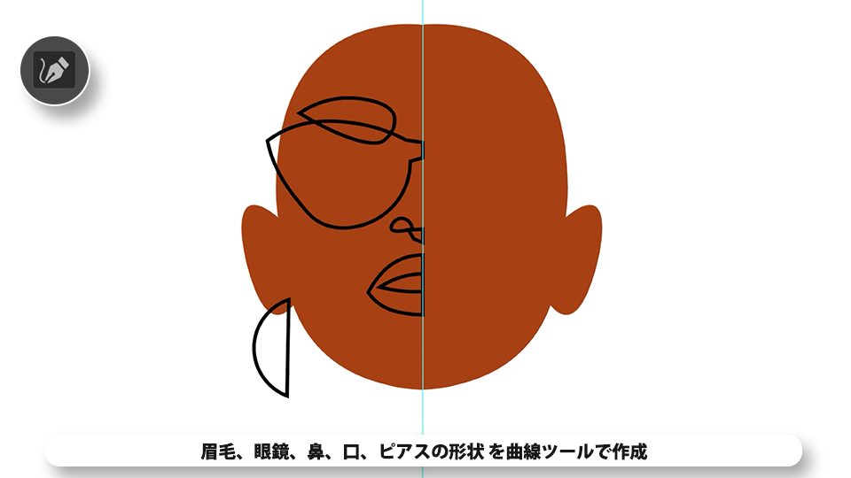 顔の輪郭同様に、曲線ツールで眉毛、眼鏡、鼻、口、ピアスの形状をトレースしてパスを作成し、リフレクトツールで鏡面コピーします。