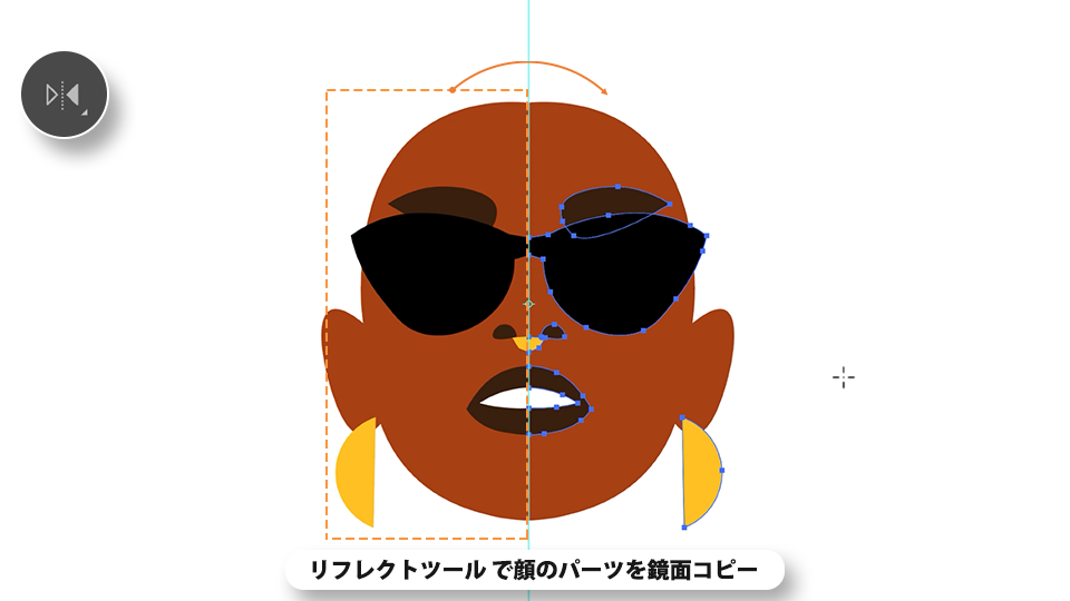 ツールバーで「リフレクトツール」を選択して、顔のパーツを右側に鏡面コピーし ます。