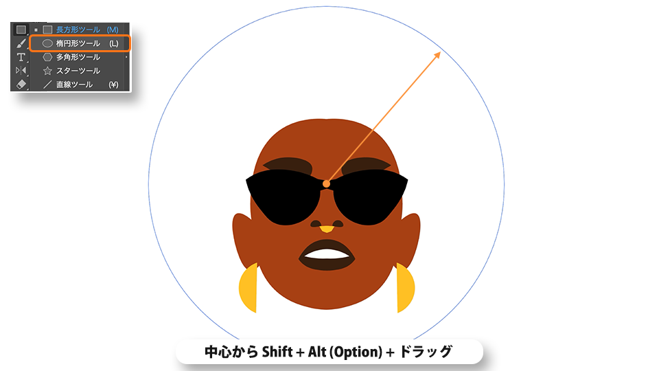 AltあるいはOptionキーを押しながらドラッグすると、円を描く始点を中心にすることができます。