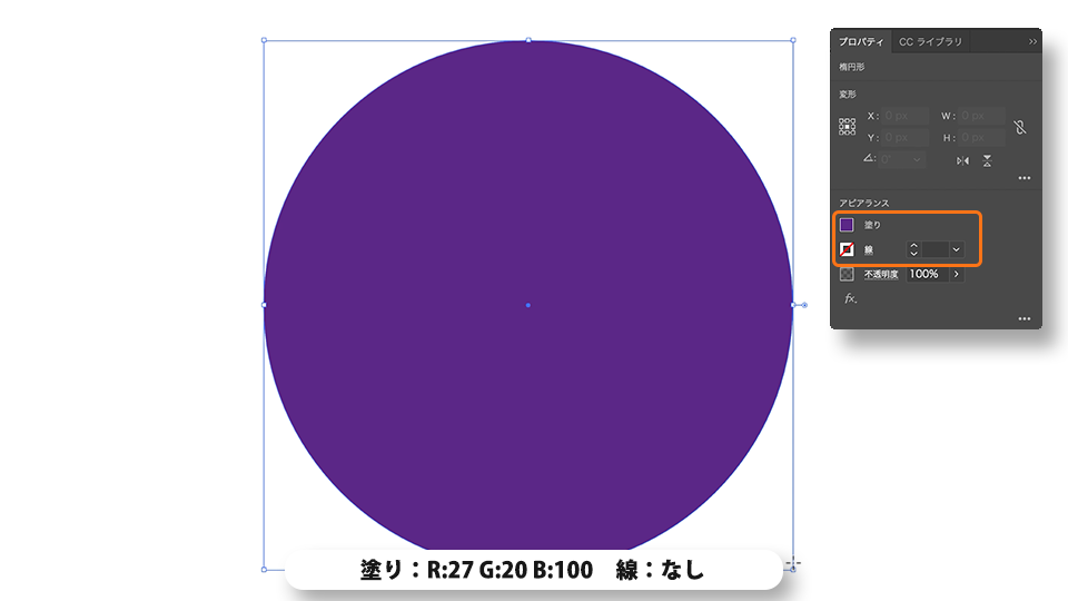 プロパティパネルを開き、「アピアランス」から 塗りと線を以下のように設定します。