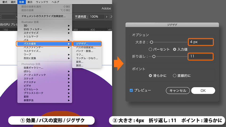 「効果」-「パスの変形」-「ジグザグ」を選択します。
