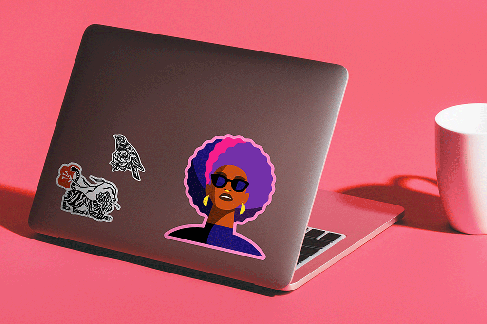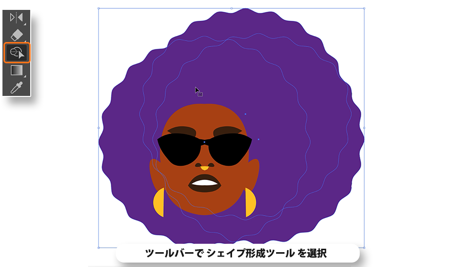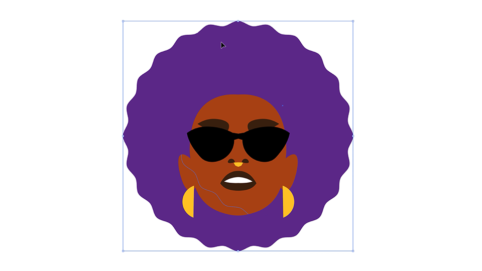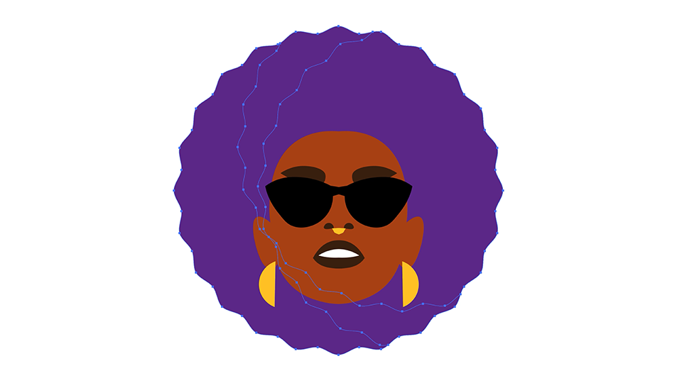 正円のシェイプを作成し、モデルの髪型をイメージできるようにジグザグ効果を使用してアウトラインが大きく波打つように変形します。次に髪型のシェイプを複製し、色を変えて髪をカラフルに彩り、不要な部分を切り取ります。