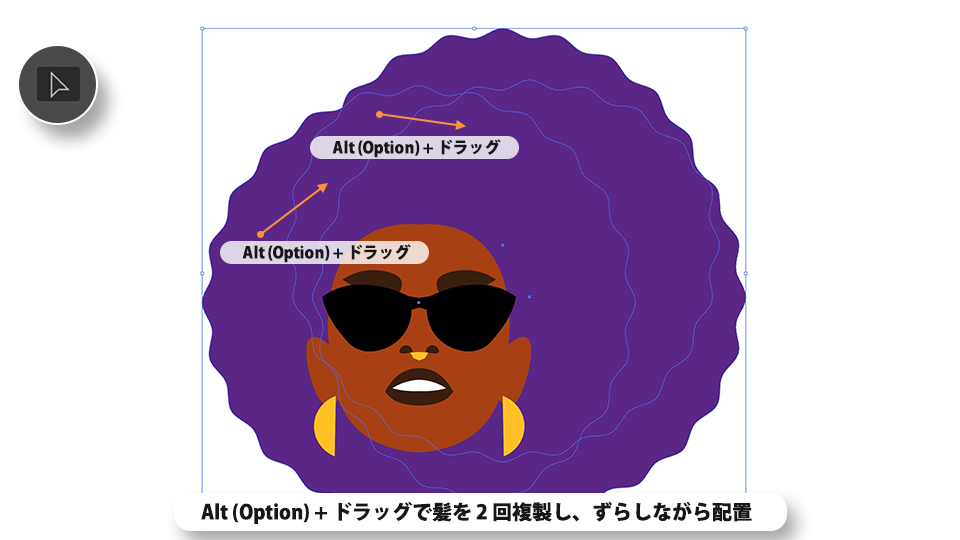 「選択ツール」で、WindowsならAltキーを、macOSならOptionキーを押しながらドラッグして、髪を2回複製します。