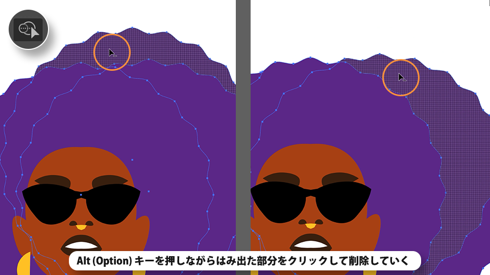 WindowsならAltキーを、macOSならOptionキーを押しながらはみ出た髪の部分をクリックします。