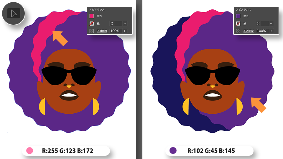 「選択ツール」で複製した髪を選択し、それぞれに塗りの色を設定します。