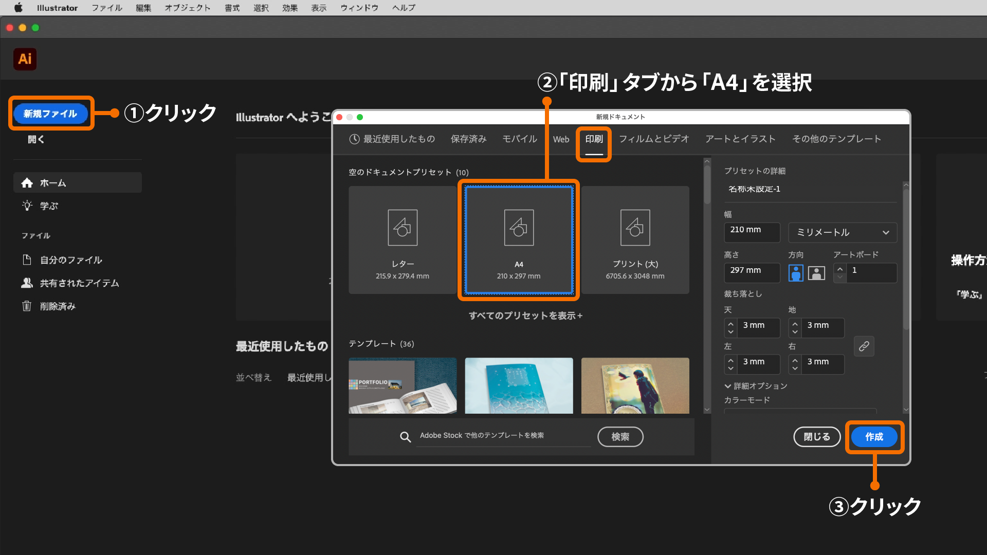 「プリセットの詳細」にA4サイズ・縦・印刷向けの設定が既に適用されているのを確認し、「作成」をクリックしましょう。