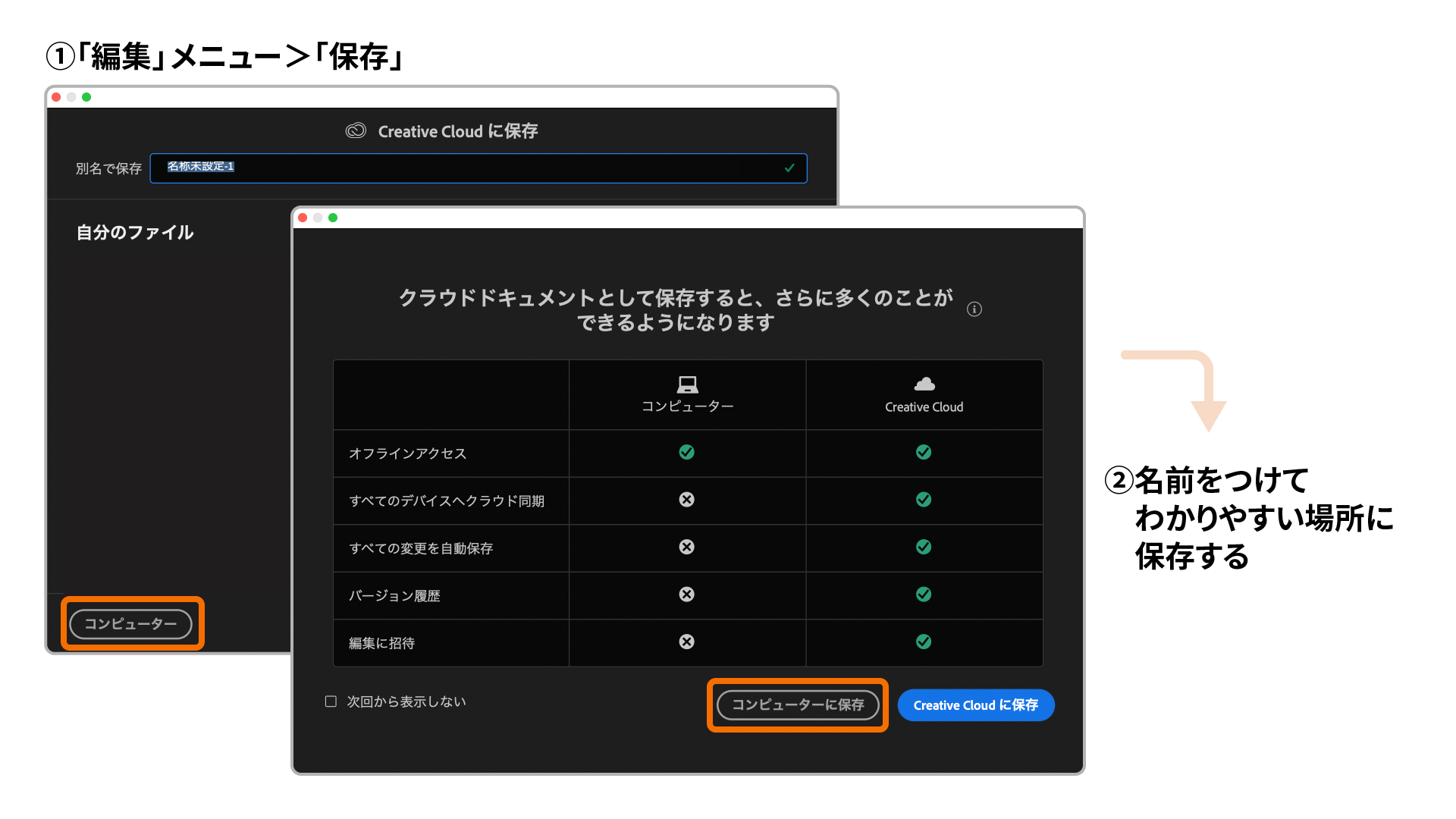 新規ドキュメントが作成できたら、まずはファイルメニュー>保存 で保存しましょう。新規ドキュメントを保存する時は、保存先にクラウドまたはコンピューターのどちらかを選択できます。今回はわかりやすく、「コンピューター」をクリックして保存しましょう。