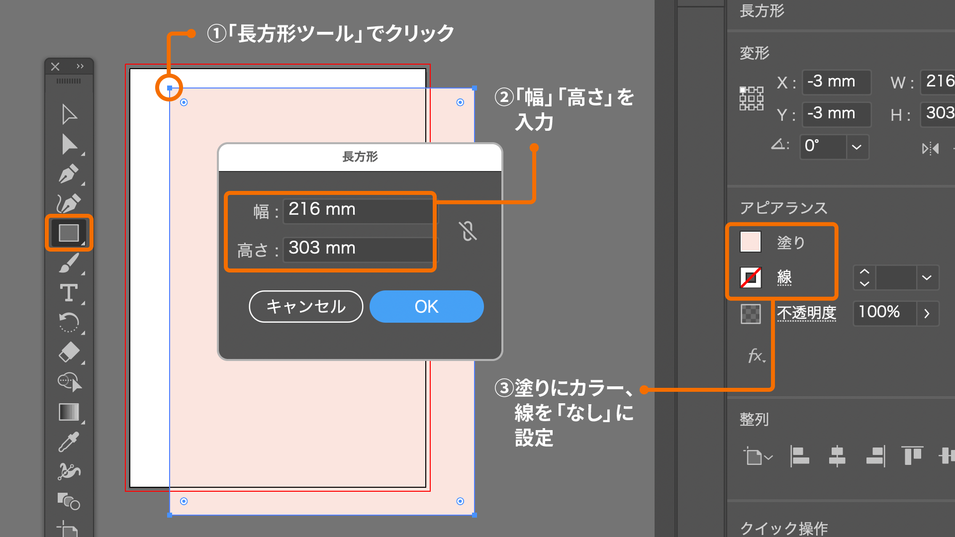 ツールバーで長方形ツールに切り替えて画面上をクリックすると、数値指定を行うダイアログが表示されます。A4サイズ(210×297mm)に、上下左右3mmずつ塗り足しを追加した大きさとして、「幅:216mm」と「高さ:303mm」を入力して「OK」をクリックしましょう。