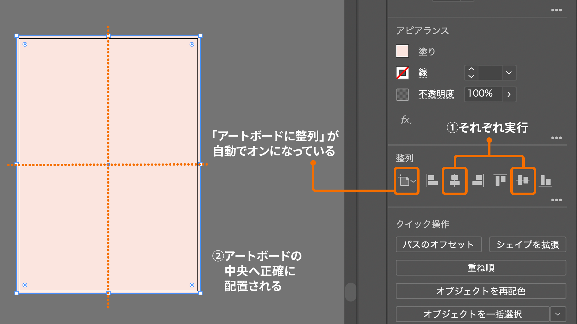 作成した長方形を選択したまま、プロパティパネルの「整列」セクションから「水平方向中央に整列」、「垂直方向中央に整列」をそれぞれ実行します。オブジェクトをひとつだけ選択している時は整列の基準が自動的に「アートボードに整列」になるため、アートボードに対して正確に配置できます。