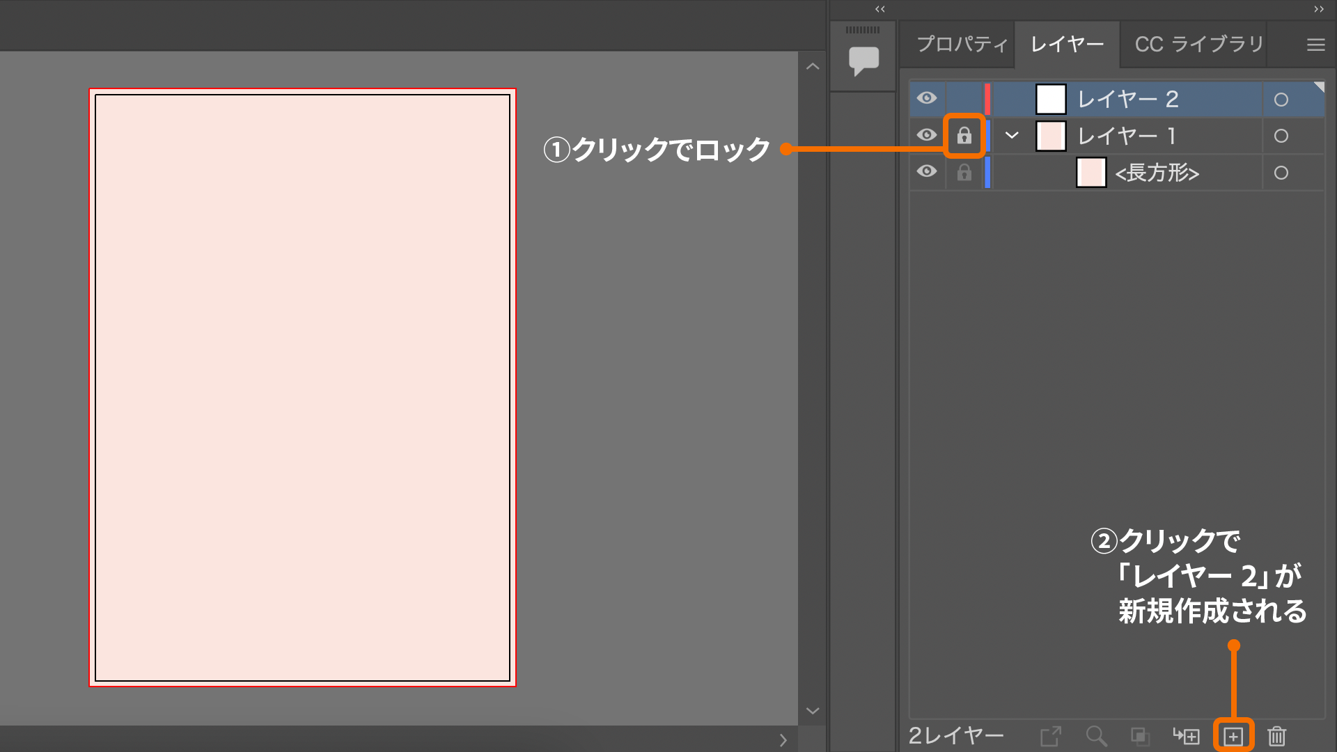 ロックができたら、パネルの下にある「新規レイヤーを作成」をクリックします。以降は、新規作成された「レイヤー2」に対してオブジェクトや文字などを配置して作業を進めましょう。
