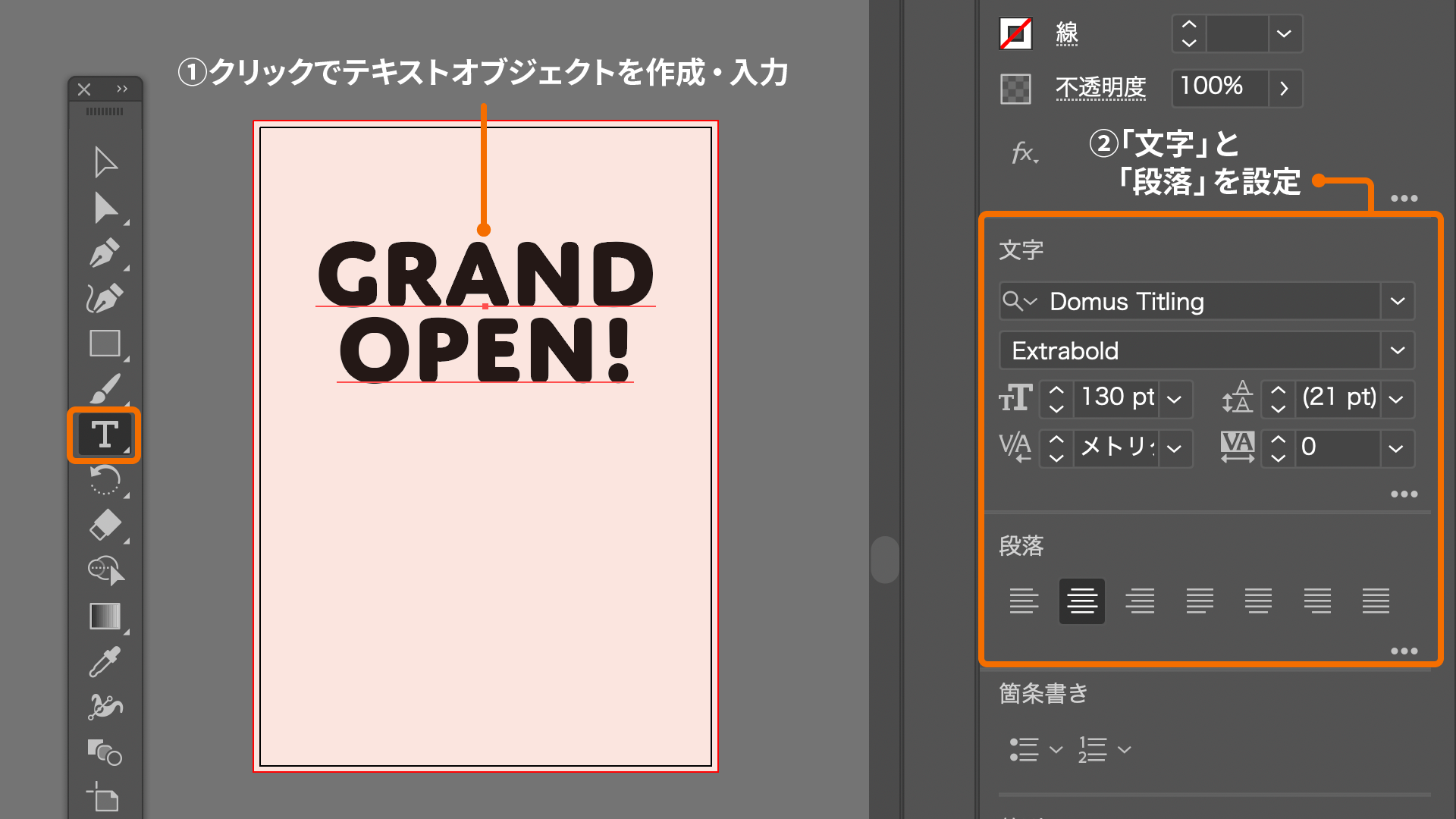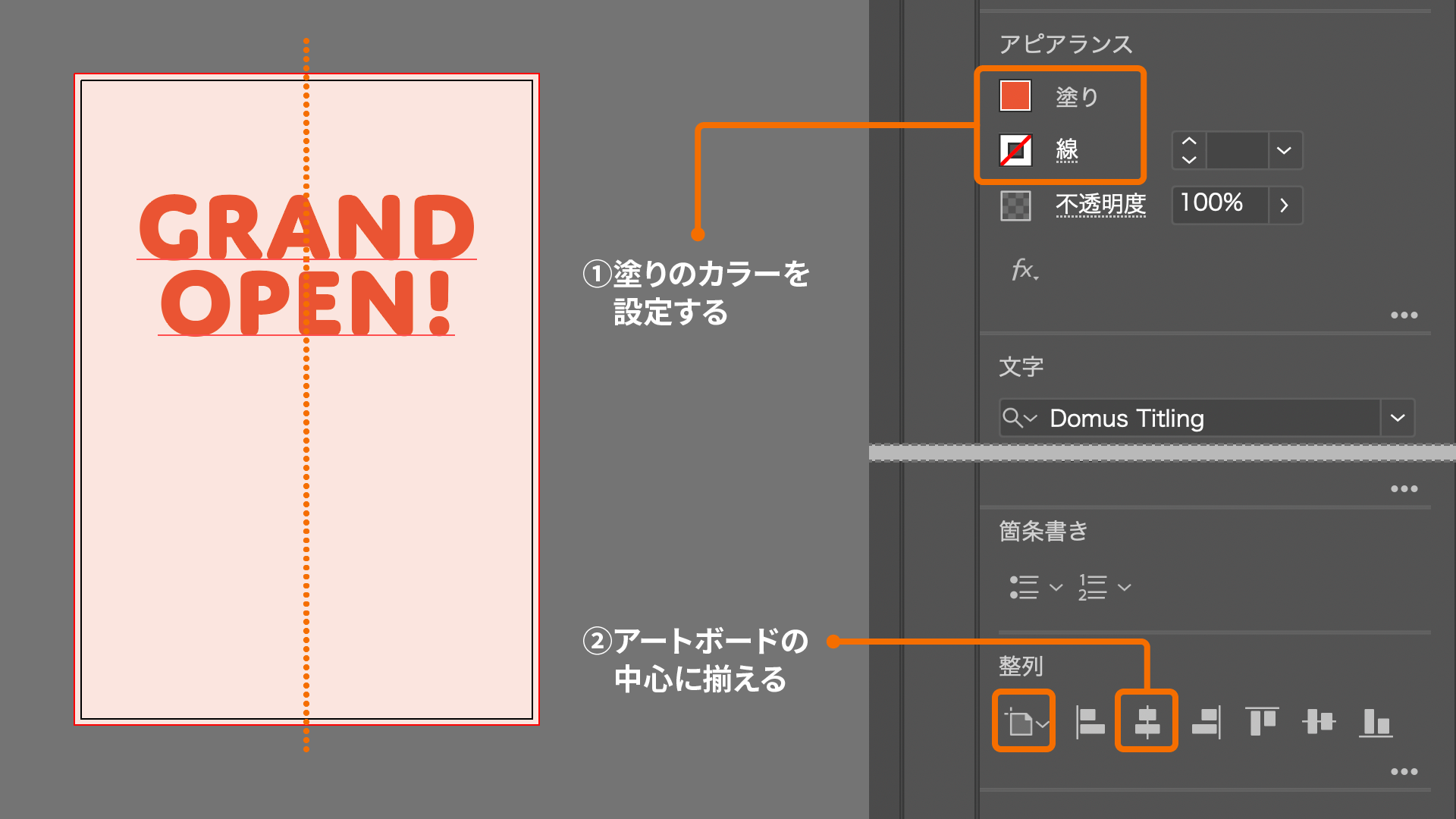 テキストオブジェクトの塗りのカラーには「M80 Y80」を設定し、赤系のカラーでインパクトを出します。テキストオブジェクトを選択してプロパティパネルの「整列」で「水平方向中央に整列」を実行し、アートボードの中心に配置しましょう。これでタイトル部分の完成です。