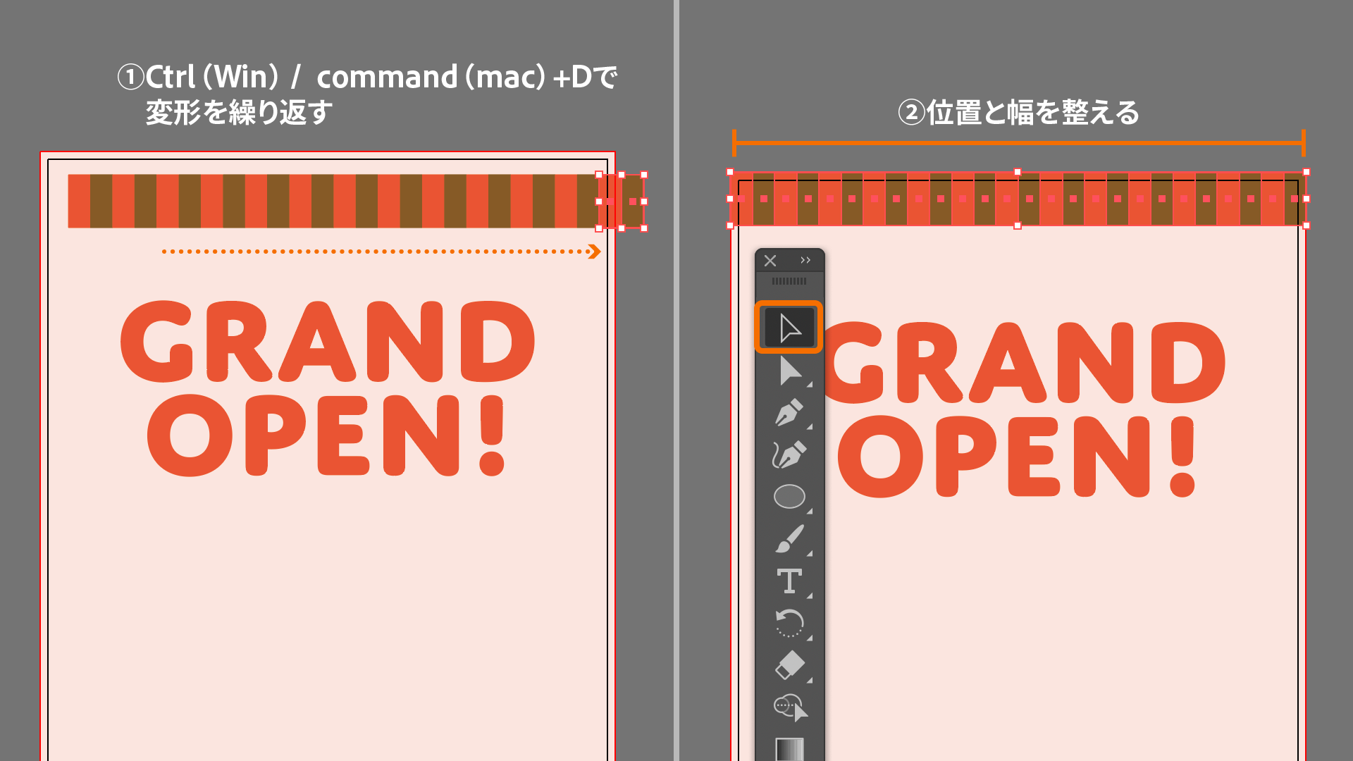 ストライプ状にパーツが並んだら選択ツールで全体を選択し、塗り足しも含めてアートボードの角にぴったりと配置しましょう。全体の幅が合わない場合は、バウンディングボックスを使って調整します。