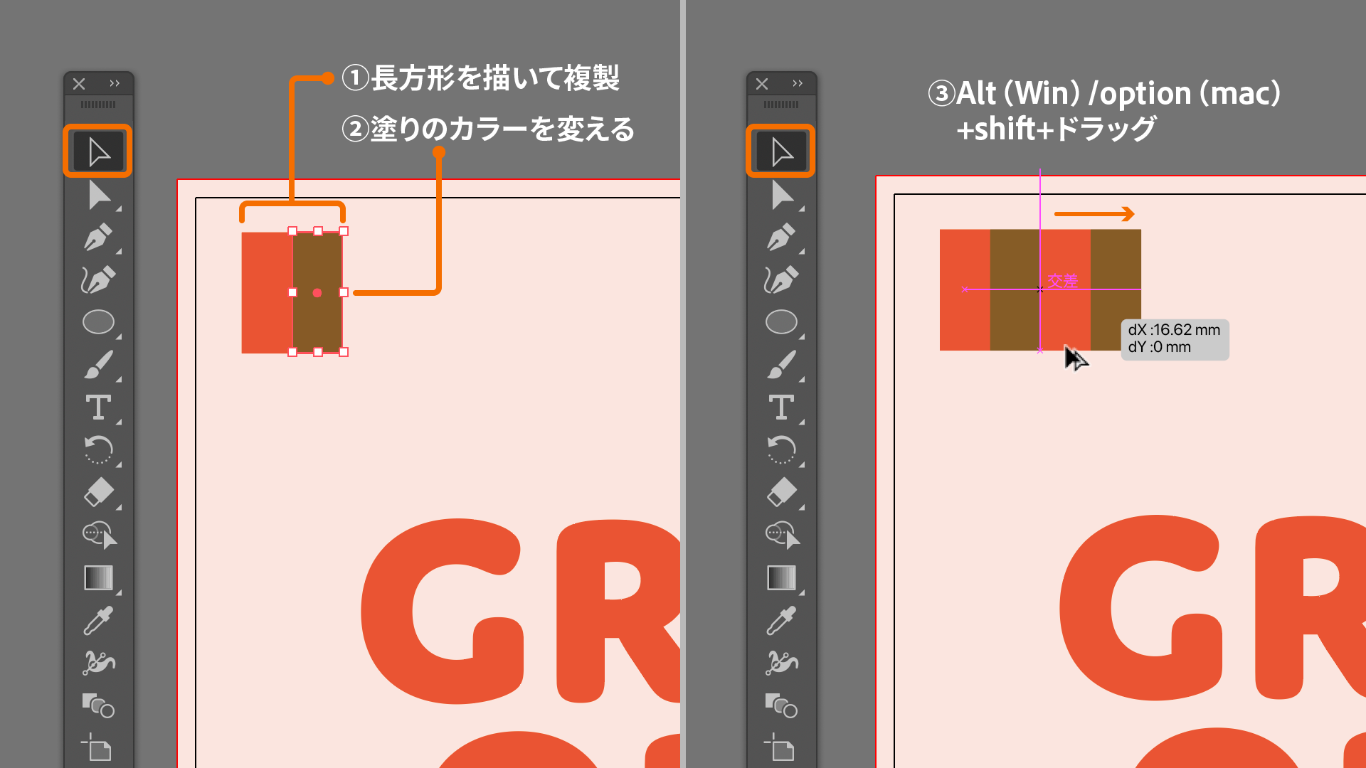 赤と茶色、2つの長方形が並んでいる状態になったら、選択ツールで長方形を2つとも選択し、同じ手順で隣へ移動しながら複製します。このとき、長方形同士がぴったりと並ぶ位置へ複製しましょう。