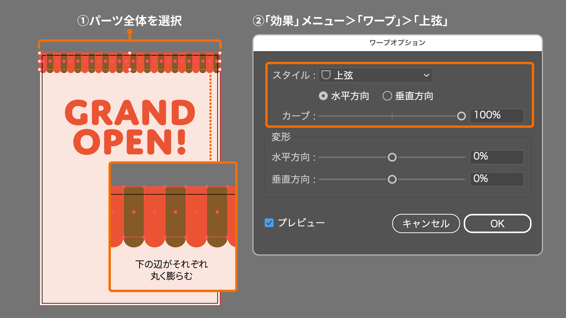 パーツ全体を選択している状態で、効果メニュー>ワープ>上限 を実行します。ダイアログで「スタイル:上弦」、「水平方向」、「カーブ:100%」を設定して「OK」をクリックしましょう。