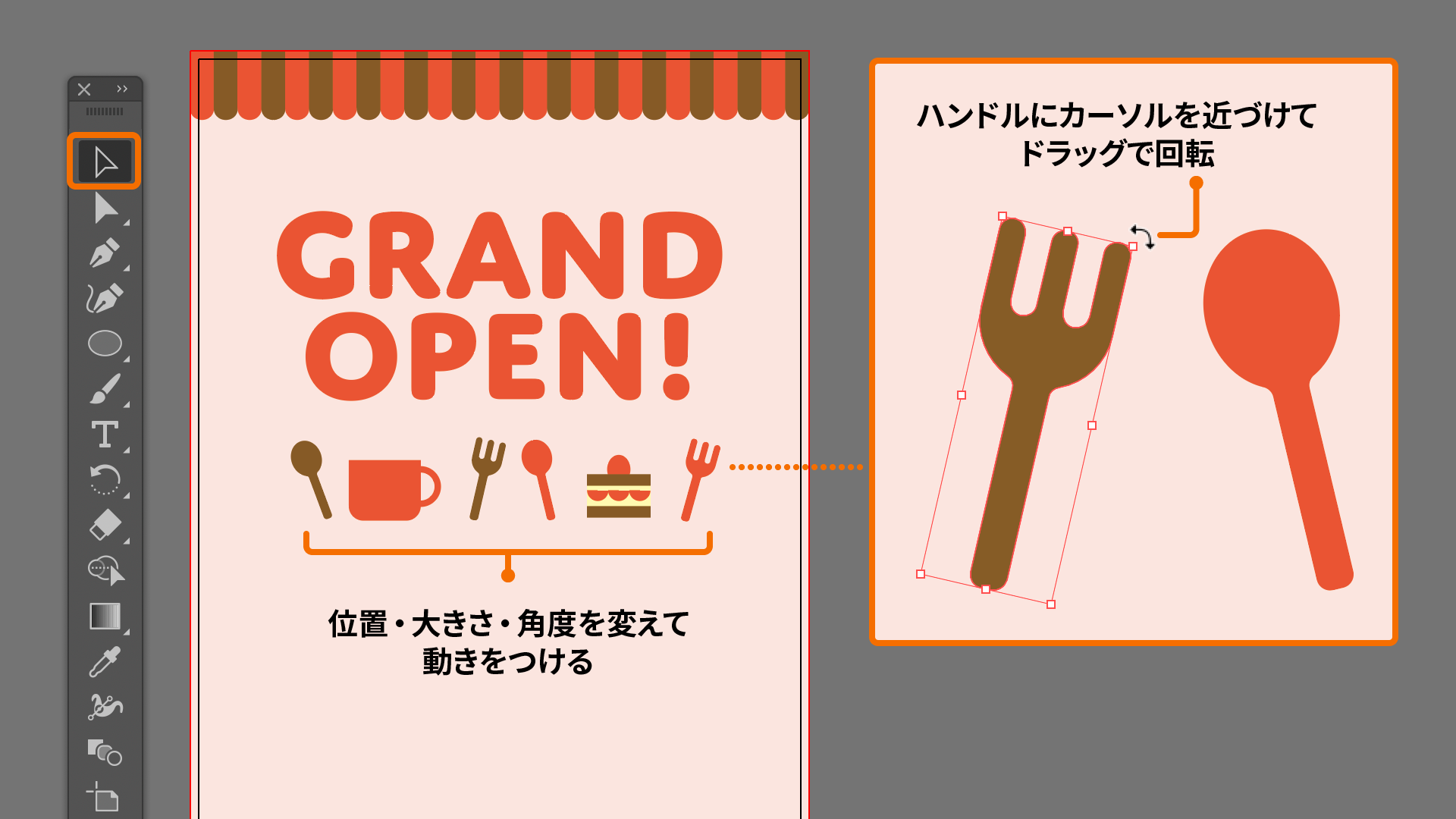 選択ツールで表示されるバウンディングボックスでは、移動、拡大・縮小のほかに回転ができます。四隅のハンドルにカーソルを近づけてドラッグするとオブジェクトが回転します。位置や大きさ、角度などをそれぞれ調整し、それぞれのパーツに動きをつけて、画面をにぎやかな印象に仕上げましょう。