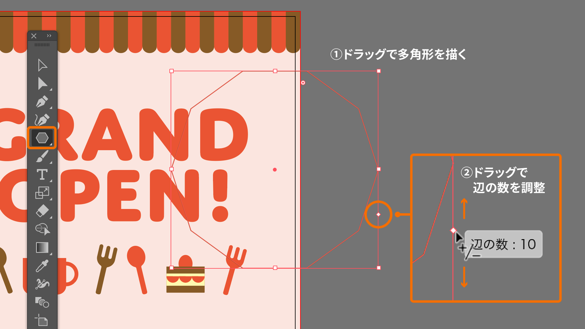 ツールバーで長方形ツールを長押しして、多角形ツールに切り替えます。多角形ツールでshift+ドラッグして多角形を描き、バウンディングボックス上のウィジェットをドラッグして「辺の数」を10にしましょう。