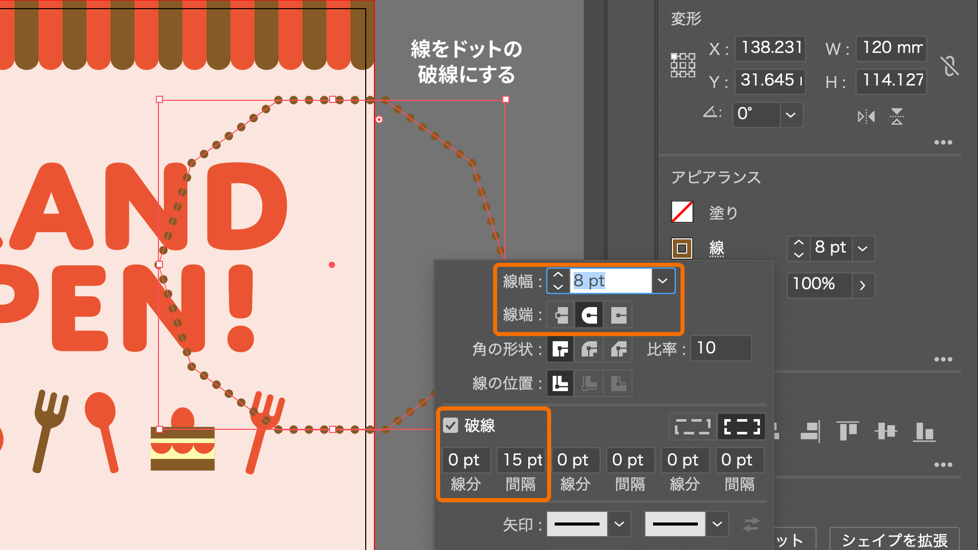 十角形を選択したまま、プロパティパネルの「線」の項目をクリックしてパネルを表示したら、以下のように設定しましょう。これで、線が丸いドットの破線になります。
