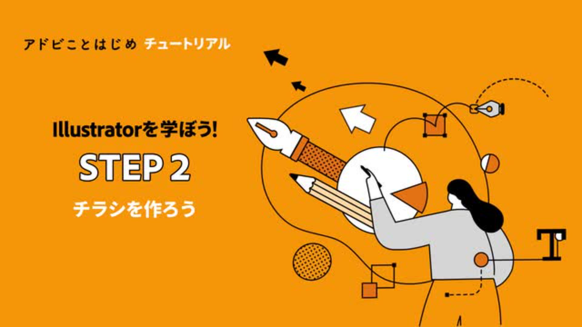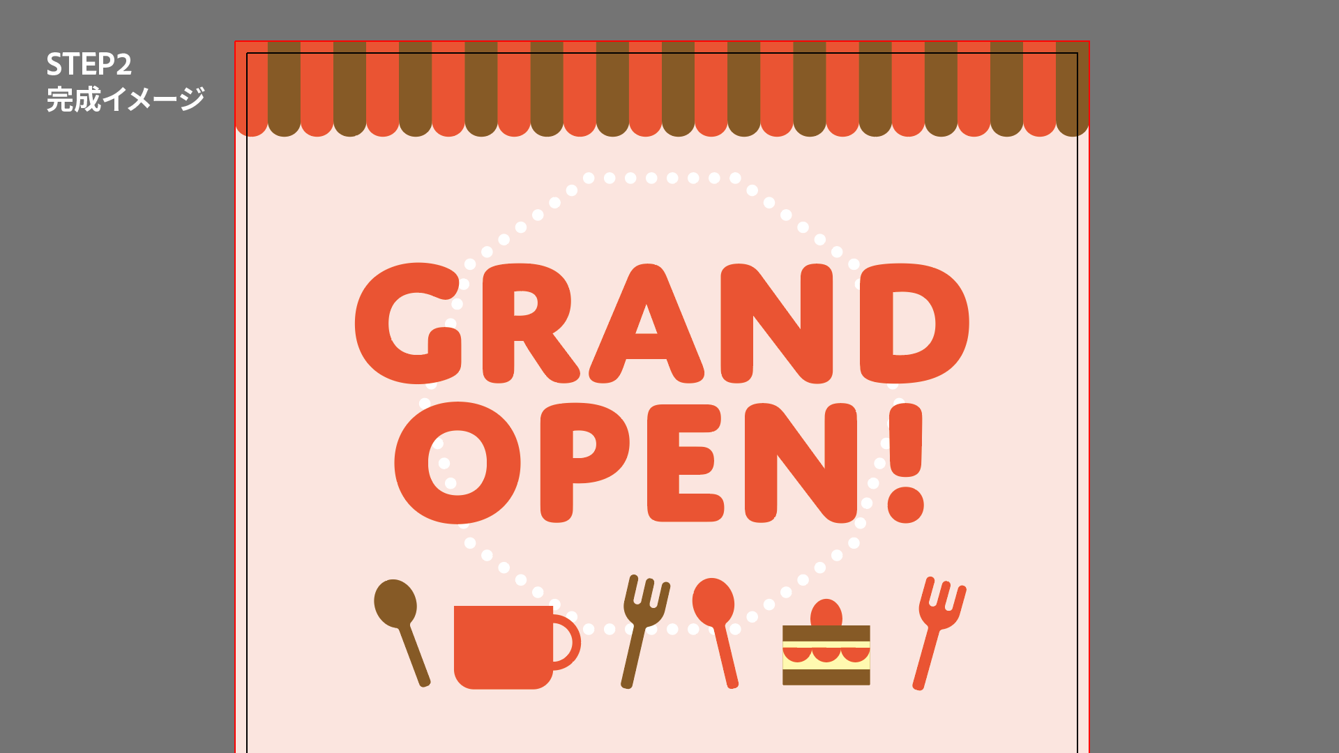 STEP2とSTEP3の2回に分けてチラシを完成させましょう。STEP2では、まずは新規ドキュメントを用意して、チラシのタイトル部分や装飾パーツを作ります。STEP1で作成したイラストも使用しますので、前回作成したファイルがある方はそちらをご用意ください。STEP2から始める方は、サンプルファイルをダウンロードして開き、そこから素材を流用しましょう。