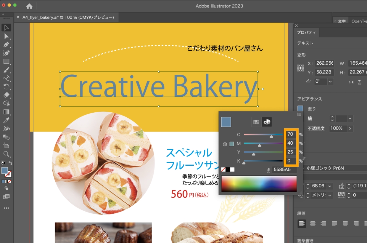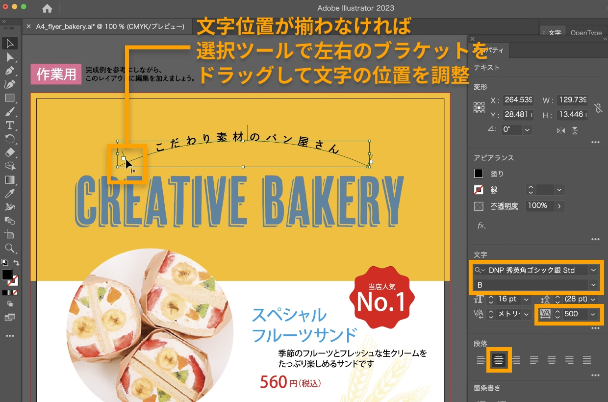 選択ツールで「Creative Bakery」のテキストオブジェクトをクリックします。テキストオブジェクトを選択したまま、以下の手順を続けましょう。