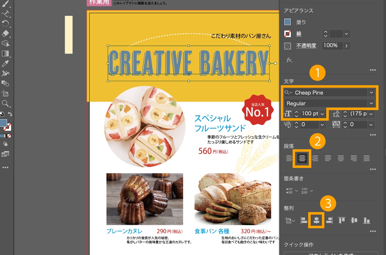 Adobe Fontsの豊富なフォントから、レイアウトの雰囲気に合うものを適用しましょう。文字揃えや整列も活用して整えます。
