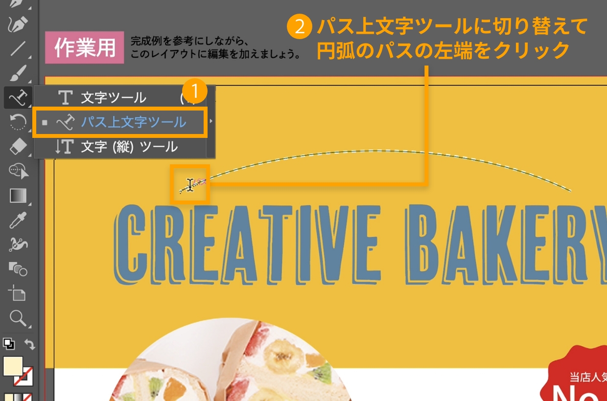 パス上文字ツールに切り替えて「Creative Bakery」の上に配置された円弧のパスの左端をクリックし、パス上文字に変換しましょう。編集>ペーストを実行すると、パスに沿ってテキストが入力されます。escキーで文字の編集を終了しましょう。