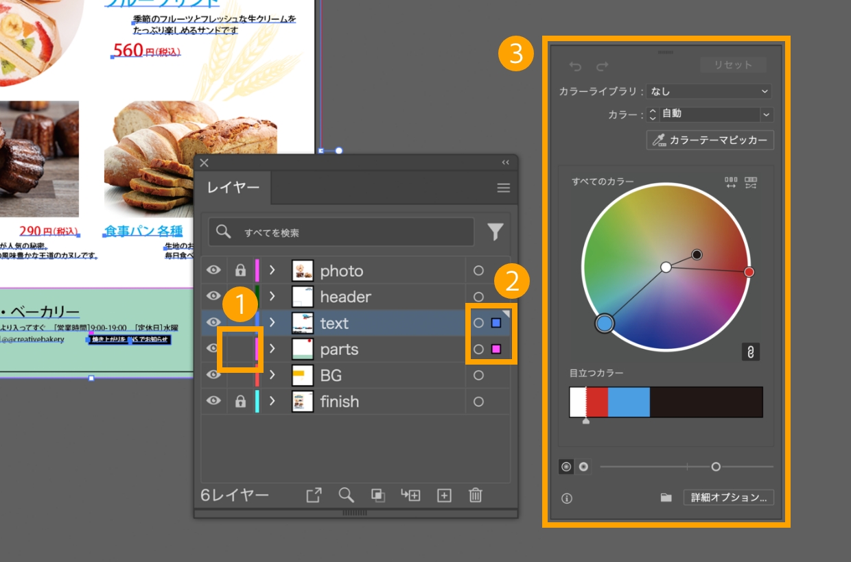 レイヤーパネルで「parts」レイヤーの「ロックを切り替え」(鍵のアイコン)をクリックして、ロックを解除します。「text」と「parts」レイヤーのターゲットアイコンをshift+クリックし、2つのレイヤー全体を選択しましょう。編集>カラーを編集>オブジェクトを再配色を選択すると、「オブジェクトを再配色」のダイアログが表示されます。